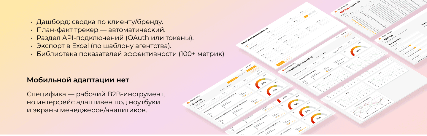 **Подĸлючение API**: Facebook, Google Ads, Yandex.Direct, VK, TikTok, MyTarget.